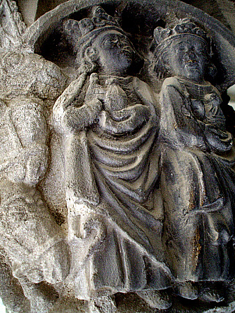 Aquests pastors, habillats segons l'època, estan representats, possiblement, sonant instruments musicals, de forma semblant a com són interpretats en altres representacions romàniques i gòtiques primerenques.