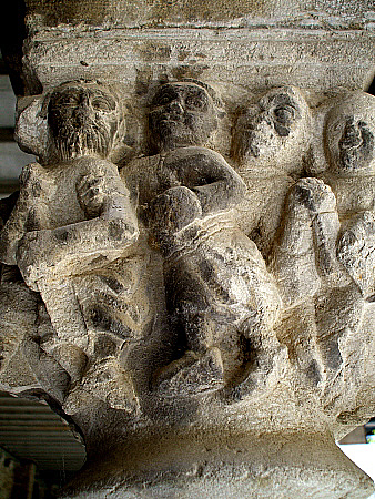 Una interpretació de l'escena correspón al Judici Final, interpretant la figura a l'esquera de Crist com un pecador, basant-se en que la part inferior de la figura serien les flames de l'infern, i el cap als seus peus, un àngel. Una altra interpretació explica que seria una escena del Sant Sopar, atenent a una possible aura darrera el cap de les dues figures lateral, que serien apòstols, i la figura de terra seria Judes. En una altra de les cares, dues figures assegudes, amb mantell, amb els caps ajuntats, que podria ser la continuació de l'escena anterior, si fós el sant sopar. En una tercera cara, un grup de quatre figures desfiles agades de bracet; no és té un significat prou basat per identificar l'escena. |