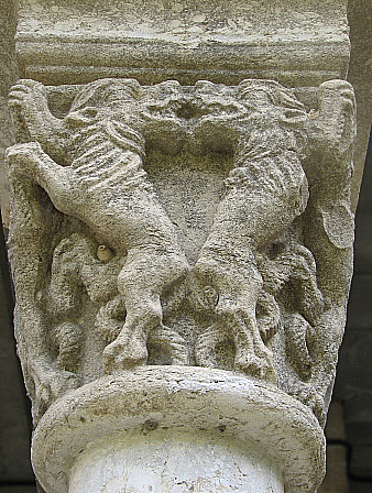 El nē 9 (dreta) de temātica de lleons afrontats pel cap, potes anteriors afrontades i el cap girat vers el cos, seguint un disseny simčtric esquerra-dreta, similar al capitell nē 7, capitell nē 12 i , capitell nē 14.