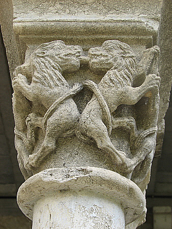 El nē 12 (esquerra) de temātica de lleons afrontats pel cap, potes anteriors i cua afrontades, i el cap girat vers el cos, seguint un disseny simčtric esquerra-dreta, similar al capitell nē 7, capitell nē 9 i , capitell nē 14.