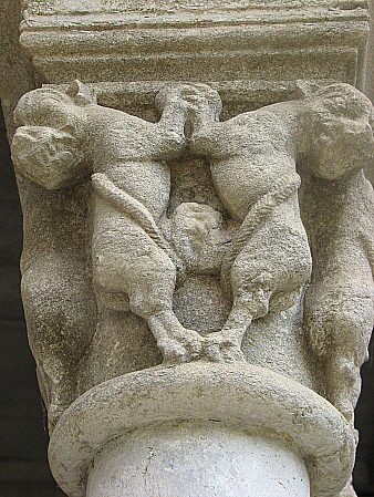 El nº 16 (esquerra) de temàtica de lleons afrontats perles potes, conpartint el cap cada dos un, potes anteriors i posteriors afrontades, i el cap girat vers el cos, seguint un disseny simètric esquerra-dreta, similar al capitell nº 5.