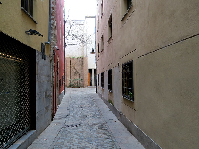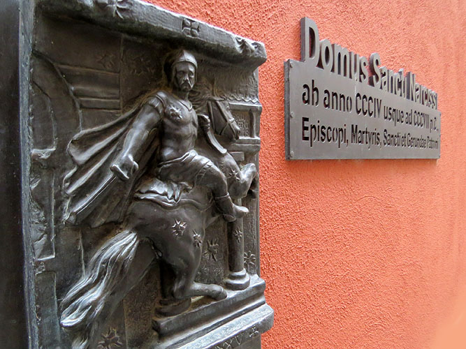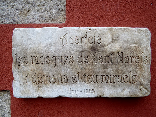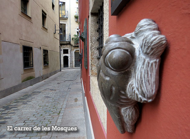 El carrer de les Mosques es troba situat dins l'antic burg de Sant Feliu, i serveix per comunicar el carrer de la Barca amb el carrer del Pou Rodó. El seu curiós nom fa referència a les mosques que sortiren de la tomba de Sant Narcís, patró de la ciutat, quan va ser atacada per les tropes franceses del rei Felip l'Ardit el 1285. El fet d'questa defensa entomològica es va repetir durant el setge de 1653 dels francesos, manats pel general Plessis-Bellière i el mariscal d'Hocquincourt, fet que es va repetir el 1684 contra les tropes del mariscal Bellefond, i també, durant la Guerra del Francès, els gironins varen tornar a invocar el seu sant patró, i el nomenaren "Generalísimo de mar y tierra".
