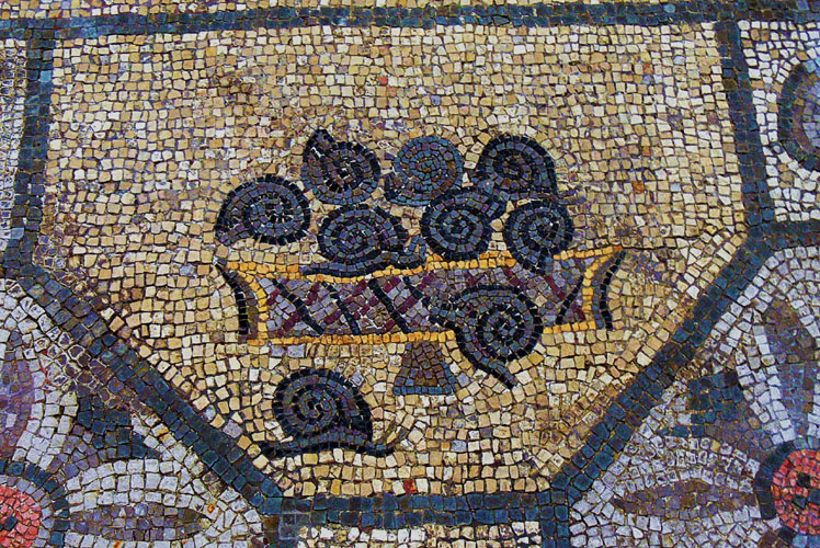 Cargols en una plata. Mosaic segle IV. Basílica d'Aquileia. (Viquipèdia)