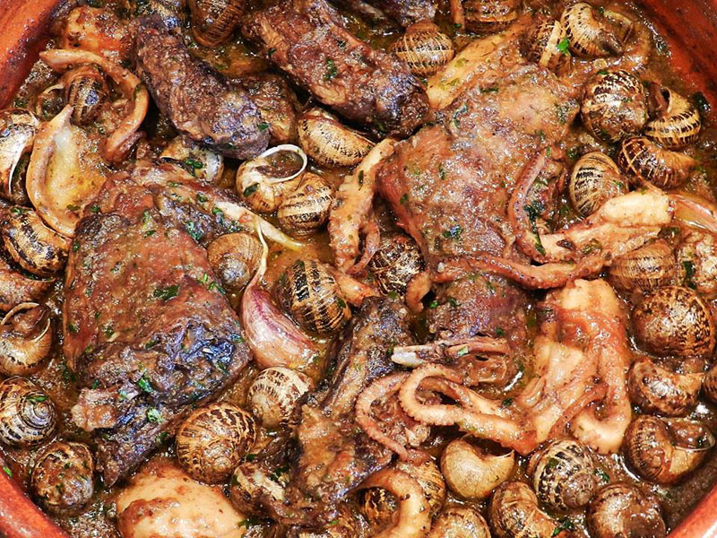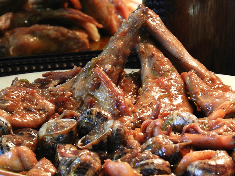 Com sempre hem d’insistir que cal qualitat en els ingredients: conill bo, cargols vius i dejunats, oli verge extra, bona ceba, i en aquest plat poca cosa més (Foto).