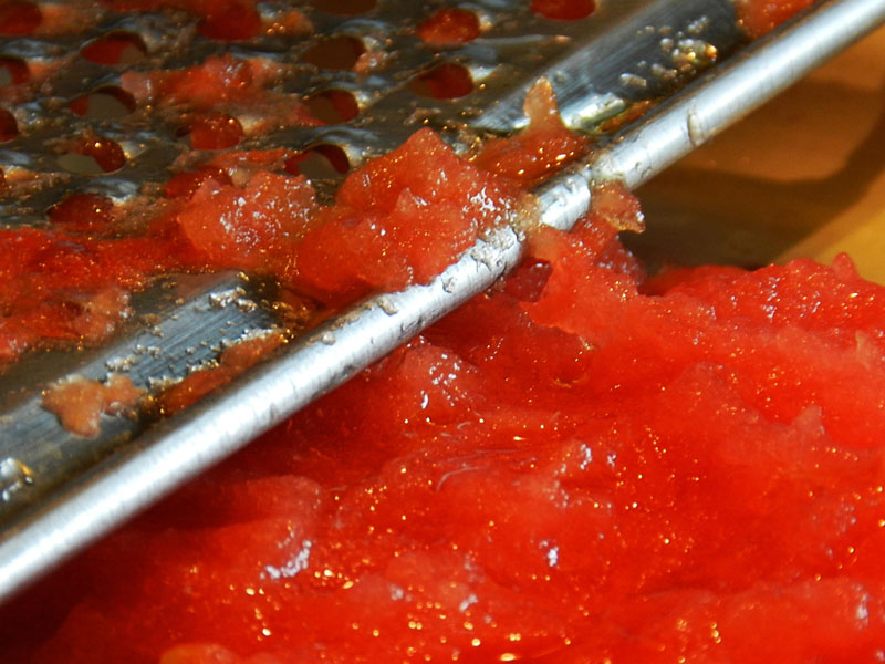 Mentrestant ratlleu les tomates, i si podeu retireu la grana. També es fa aquesta samfaina amb la tomata pelada i tallada a trossos, o una barreja de trossos i tomata ratllada. En aquest cas la ratllem tota. (Foto)