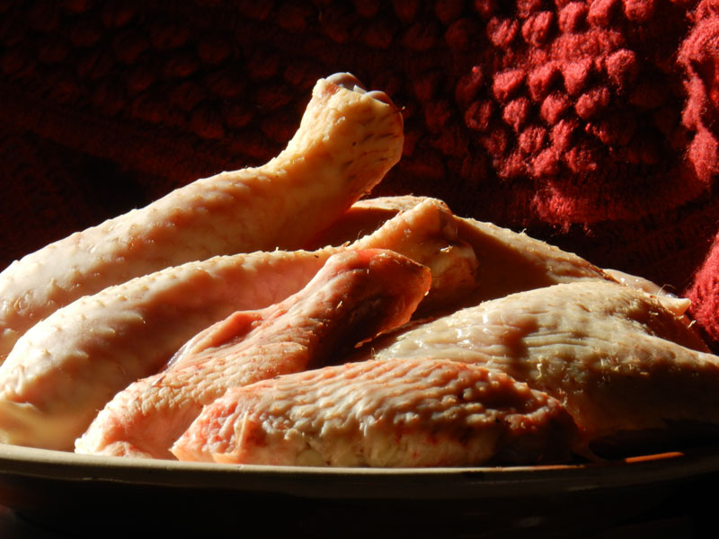 Recepta - Donat que els pollastres de pagès tenen una mida considerable, podeu demanar al carnisser que us el talli a octaus. Un cop a casa socarrimeu els trossos a la flama si és que queden restes de plomes. Salpebreu els trossos per totes bandes.
