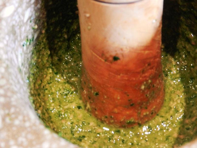 Aprofiteu el temps mentre bull el fumet per fer l’all-i-oli, que en aquest cas, no és un all-i-oli ben bé, tampoc és del tot una picada. Tan sols volem aprofitar el fetge de les escórpores, o si són massa petits un trosset de fetge de rap a la peixateria. El fetge del peix aporta un gust apreciable al suquet. En un morter aixafarem un gra d’all fins que quedi feta una pasta, tot seguit hi afegim el fetge a trossets i continuem brandant la pasta. Un cop l’all i el fetge ben integrats començarem a fer un petit all i oli anant afegint rajolins d’oli al morter. En aquest cas no us preocupeu massa que no agafi o que no s’emulsioni. Un cop fet hi posem una mica de julivert picat i la copeta de vi ranci que ens ajudarà a que es dissolgui bé quan aboquem la morterada a la cassola. Si voleu podeu provar d’afegir-hi un grapadet de pinyons o una llesca petita de pa al morter, llavors ja seria una picada. (Foto A) - (Foto B).