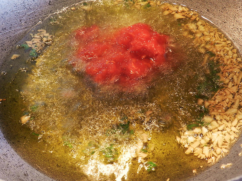En una cassola de ferro colat o alumini gruixut, -també podeu fer servir una cassola de terrissa si el feu a casa- amb un bon raig d’oli comenceu a sofregir un gra d’all picat ben menut o bé a làmines. També es feia amb les dents d’all senceres o esclafades. Tan bon punt l’all agafi color -sense que mai s’arribi a cremar- hi aboqueu la tomata madura ratllada i preferiblement sense llavors. Afegiu sal al sofregit. Deixeu el sofregit es vagi fent en uns 5 o 10 minuts (Foto).