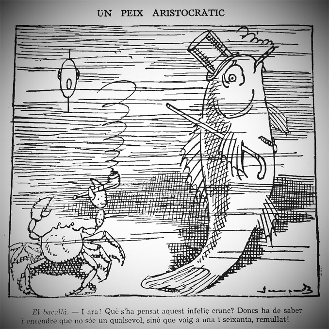 vinyeta del bacallà. Dibuix de Joan G. Junceda, 1954. Publicada al llibre "Bon seny".
