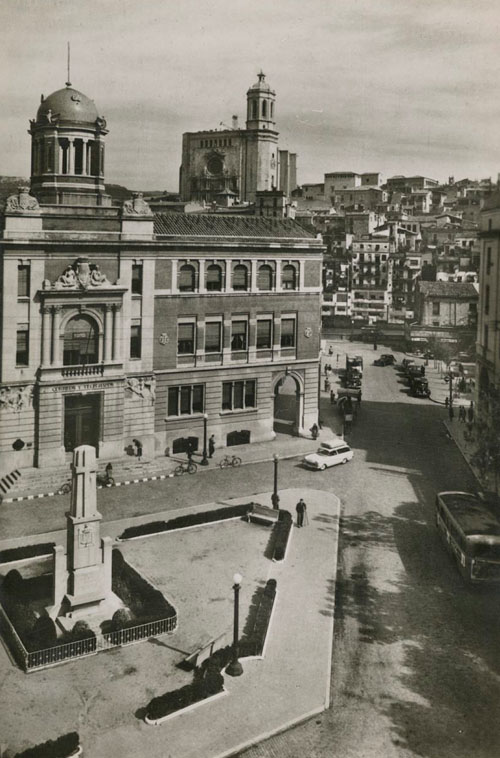 (Ampliar) - Façana de l'edifici de Correus i Telàgrafs, a la Gran Via de Jaume I. Davant l'edifici, el monument a Anselm Clavé. 1934-1940. Salvador Crescenti Miró. CRDI - Ajuntament de Girona.