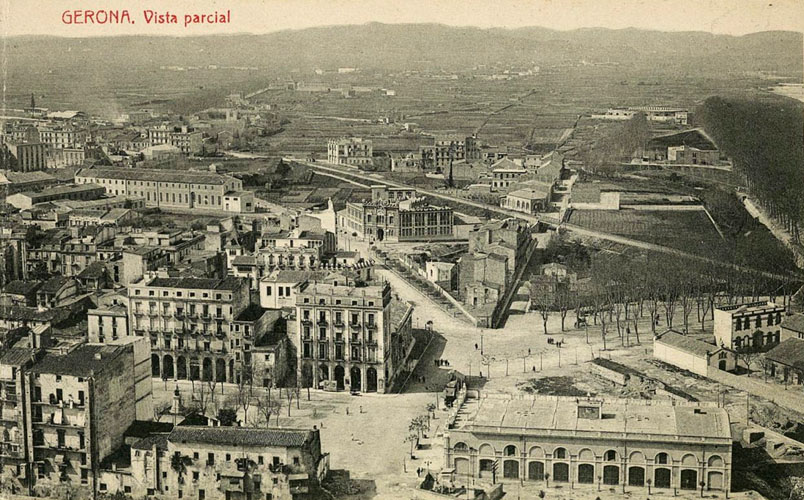 (Ampliar) - Vista del sector nord del Mercadal. S'observa el solar cedit per a la construcció de l'edifici de Correus i Telègrafs al final de la Gran Via Jaume I, a la confluència amb l'avinguda Ramon Folch, 1914-1916. Fototipia Thomas. CRDI - Ajuntament de Girona.