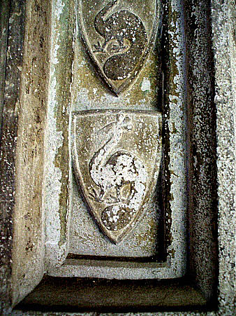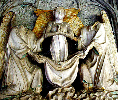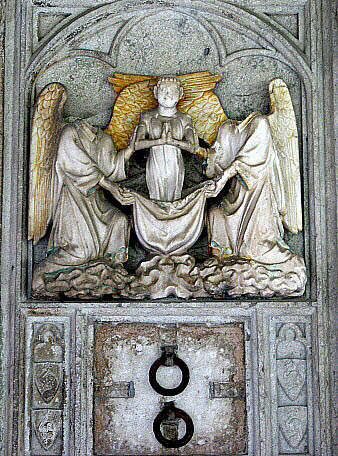 Entre les làpides, sepultures, sepulcres i ossaris empotrats als murs dels claustres, destaca per la seva vistositat una peça vertical, desenvolupada per franges, amb baixos i alts relleus, decoratius els uns i figurats amb àngels els altres.