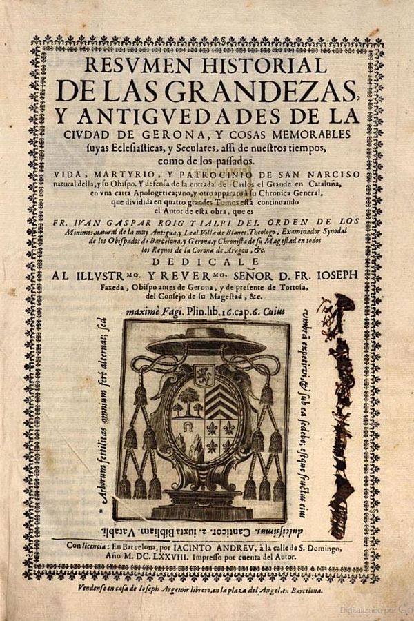 - Portada de "Resumen historial de las grandezas, y antiguedades de la ciudad de Gerona..." de Joan Roig i Jalpí, 1678.