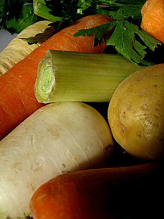 Tota la resta és bastant igual: la gallina, els menuts del pollastre (el fetge i el pedrer), la vedella, la cansalada, que no ha d'ésser mai rància. I la botifarra negra o clara, és clar, perquè és el país ideal de les botifarres. I les patates, la col, les pastanagues, els cigrons i quatre mongetes seques. Tot plegat constitueix un petit món molt apreciable.