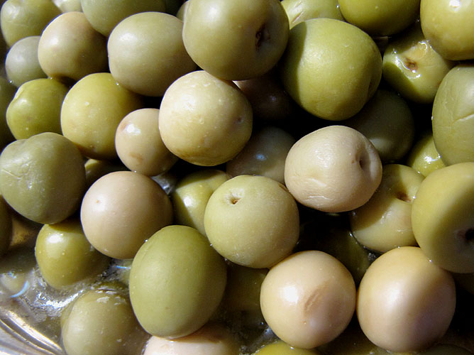 - Verdes. Són les obtingudes de fruits recollits en el cicle de maduració abans de l’hivern i quan han arribat a mida normal. Aquestes olives són fermes, sanes, i no han de tenir altres taques diferents de les de la seva pigmentació natural. La coloració del fruit pot variar del verd al groc palla.