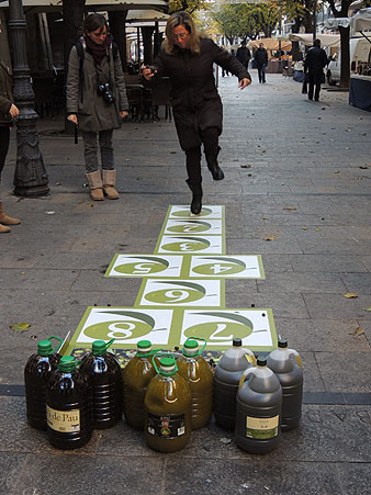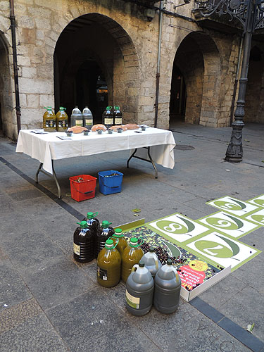 Presentació de l'oli nou de la DOP Oli de l'Empordà 2013 El dissabte 14 de desembre 2013 va tenir lloc a la Rambla de la Llibertat de Girona, la quarta edició de l'acte de presentació de l'oli nou organitzat per la Denominació d'Origen Protegida Oli de l'Empordà, amb la col·laboració de Girona Bons Fogons i el Gremi de Flequers. Per aquest motiu del 2 al 21 de desembre els restaurants adherits a aquest col·lectiu gastronòmic disposaran d'aquest oli a les seves taules. ![]() (Ampliar) - Components del grup gastronòmic Girona Bons Fogons a la presentació a la Rambla de la Llibertat de Girona. A més de tastar els olis dels trulls empordanesos, el públic va poder participar en un joc solidari a favor del Banc dels Aliments. La DOP Oli de l'Empordà ha destinat 100 litres d'oli al Banc dels Aliments mitjan&cceil;ant un joc de la xarranca en què els participants van haver de portar olives mentre jugaven. Simon Casanovas, president de la DOP, va preveure que la collita 2013 seria inferior a la de l'any anterior, en la que es van recollir prop de cinc milions de quilos d'olives, ja que durant la floració no va acompanyar el bon temps i també perquè les ventades varen malmetre una part de la collita. Malgrat això la qualitat de l'oli produït conserva una qualitat excel·lent. Reportatge de la presentaciķ. (Clicar damunt les imatges per ampliar-les) ![]() (Ampliar) - Xefs de restaurants que participen en la presentació.