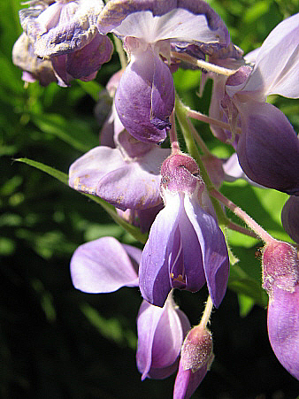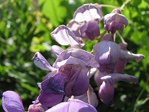 (1) - També s'esmenta que va ser un mariner anglès qui la va introduïr el 1816 a Europa. El capità Welbank, que així s'anomenava, va ser convidat per un comerciant xinès a la seva casa de Canton una nit de primavera. L'amfitrió el va rebre en una pèrgola totalment coberta de flors de glicinia, que allà rebía el nom de zi teng (vi blau). L'espectacle el degué colpir tant que al final de la vetllada va demanar-ne uns esqueixos al comerciant. El capità va fer arribar els plançons a un compatriota i tres anys més tard, el 1819, la glicinia floria per primera vegada a Anglaterra. La planta va tenir un gran èxit i en pocs anys les principals mansions europees exhibien les façanes adornades amb flors de la wisteria. Tornar al text