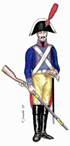 Cavalleria de Linia. Soldat del Regiment del Rei. Dibuix de Fèlix Xunclà. Basat en "Uniformes Militares Españoles. El Ejército y la Armada en 1808", de José Maria Bueno, Málaga, 1982.