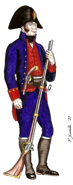 Companyies fixes. Companyia de guardaboscos. Dibuix de Fèlix Xunclà. Basat en "Uniformes Militares Españoles. El Ejército y la Armada en 1808", de José Maria Bueno, Málaga, 1982.