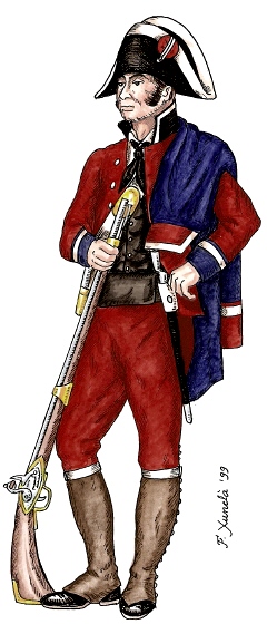 Companyies fixes. Companyia d'escopeters de Getares. Dibuix de Fèlix Xunclà. Basat en "Uniformes Militares Españoles. El Ejército y la Armada en 1808", de José Maria Bueno, Málaga, 1982.