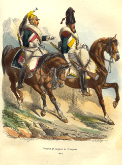 Dragó i Gastador de Dragons, 1809. Guàrdia Imperial. Làmina de Bellange (1800-1866), extreta de l'obra de P.M. Laurent de L`Ardeche Histoire de Napoleon, 1843. (Wikipèdia)