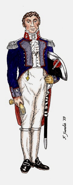 Cavalleria de Linia. Capità del Regiment de Calatrava en uniforme d'actes socials. Dibuix de Fèlix Xunclà. Basat en "Uniformes Militares Españoles. El Ejército y la Armada en 1808", de José Maria Bueno, Málaga, 1982.