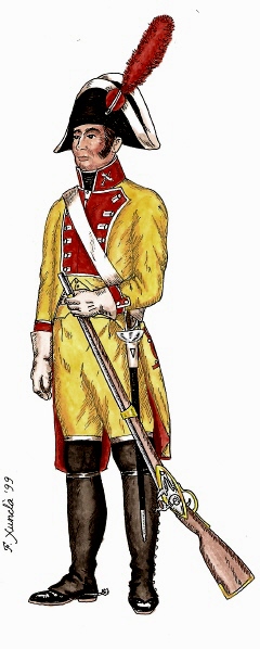 Dragons. Dragó del Regiment de la Reina. Dibuix de Fèlix Xunclà. Basat en "Uniformes Militares Españoles. El Ejército y la Armada en 1808", de José Maria Bueno, Málaga, 1982.