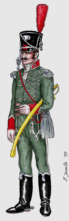 Capità de caçadors de cavalleria en uniforme de gala. Dibuix de Fèlix Xunclà. Basat en "Uniformes Militares Españoles. El Ejército y la Armada en 1808", de José Maria Bueno, Málaga, 1982.