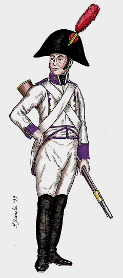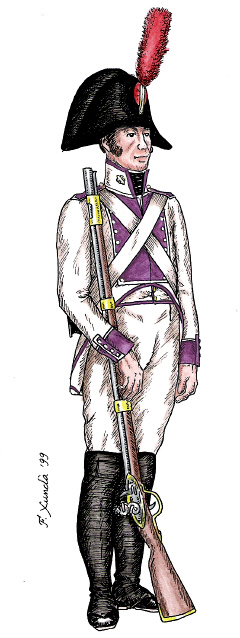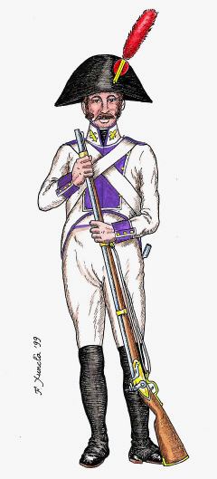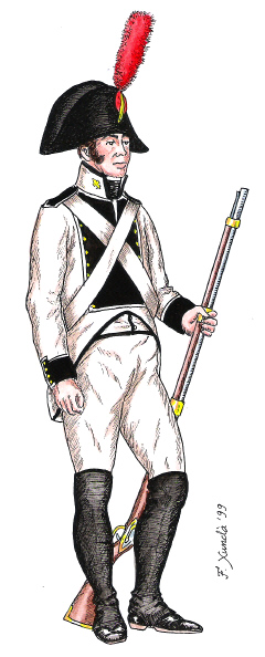 Infanteria de Línia. Fuseller del Regiment de Savoia. Dibuix de Fèlix Xunclà. Basat en "Uniformes Militares Españoles. El Ejército y la Armada en 1808", de José Maria Bueno, Málaga, 1982.