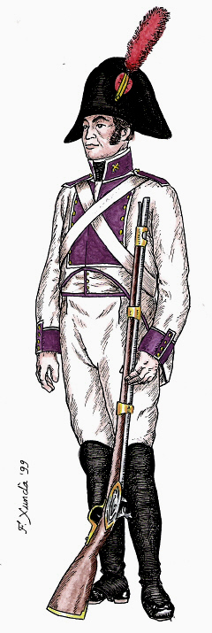Infanteria de Línia. Fuseller del Regiment de Zamora. Dibuix de Fèlix Xunclà. Basat en "Uniformes Militares Españoles. El Ejército y la Armada en 1808", de José Maria Bueno, Málaga, 1982.