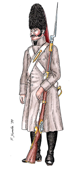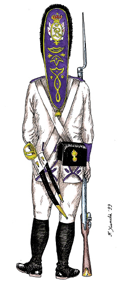Infanteria de línia. Granader amb capot. Dibuix de Fèlix Xunclà, basat en "Uniformes Militares españoles. El Ejército y la Armada en 1808", de José Maria Bueno, 1982.