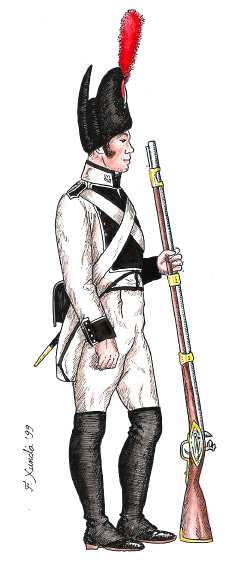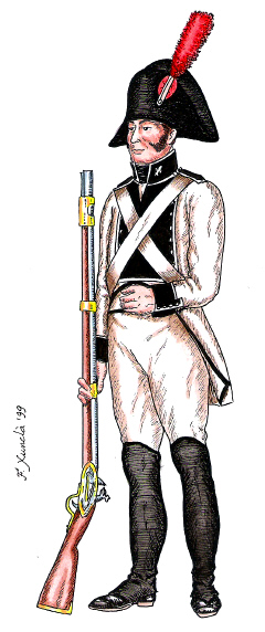Infanteria de Línia. Fuseller del Regiment de la Corona. Dibuix de Fèlix Xunclà. Basat en "Uniformes Militares Españoles. El Ejército y la Armada en 1808", de José Maria Bueno, Málaga, 1982.
