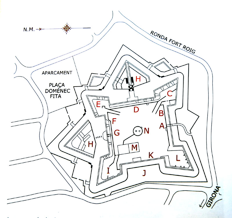 (Ampliar) - Plànol del castell de Montjuïc. A.- Porta principal. B.- Casernes. C.- Baluard d'en Pacheco. D.- Magatzems i casernes. E.- Baluard de Saint Germain. F.- Casernes. G.- Porta d'emergència amb tambor. H.- Mitges llunes (llunetes o revellins). I.- Baluard de Sant Narcís. J.- Fossat. K.- Cortina. L.- Baluard d'Ozoria. M.- Casa del governador i caserna. N.- Cisterna. Dibuix de Jordi Pericot, gentilesa de l'autor.