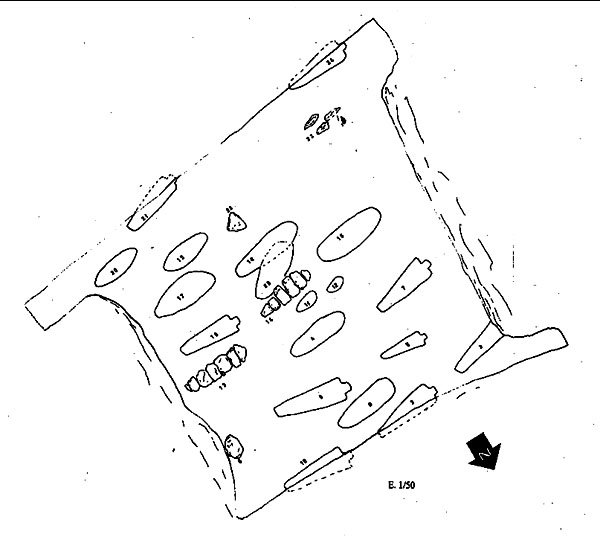 (Ampliar) - Una de les tombes localitzades durant els sondejos arqueològics del cementiri jueu de Montjuïc fets el 1999. Publicat per Lluís Palahí Grimal, op. cit.
