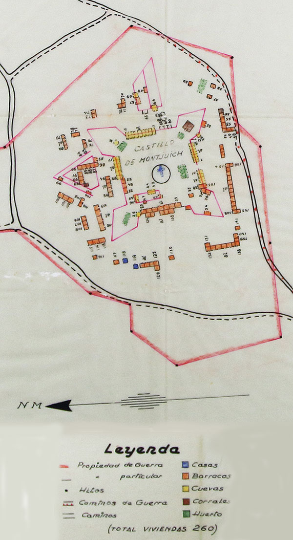 (Ampliar) - Vista de la muntanya de Montjuïc amb les edificacions d'obrers del Patronat de Cases Barates a Montjuïc. S'observa les cases encara en construcció. 1933. Fotografia Unal. CRDI - Ajuntament de Girona. D'una 'ciutat-jardí' al barraquisme. El 1930, l'Ajuntament de la ciutat comprà part de la muntanya. L'any següent s'hi construeix una escola pública, l'escola Ignasi Iglésias. El 1933 es projecta la urbanització d'un "Parc Bosc", una ciutat-jardí per a la classe obrera, promocionat pel Patronat de Cases Barates de Montjuïc, que no acabà de quallar. Vint-i-dos anys més tard, el 1955, el Pla General qualificà la muntanya de Montjuïc com a zona verda. Dos anys més tard, el 1957, la zona del Castell s'omple de barraques, adosades als murs i muralles, on resideix població immigrada provinent d'altres indrets de l'Estat. L'ocupació va arribar gairebé a les 3.000 persones.