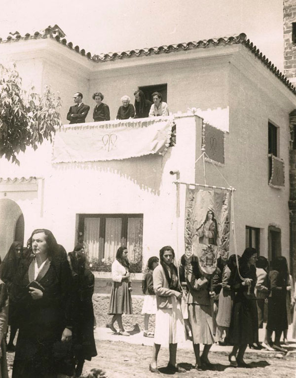 (Ampliar) - Processó de la Mare de Déu de Fàtima al Grup Sant Narcís. S'observa gent dalt d'un balcó veient passar la procesó:. 10 de juny de 1951. Narcís Grosset Oliver. CRDI - Ajuntament de Girona.