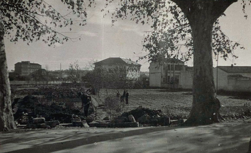 (Ampliar) - Obres de construcció del porticat de la plaça de l'Assumpció. 26 de desembre de 1949. Autor desconegut. CRDI - Ajuntament de Girona. L'origen de l'actual barri.