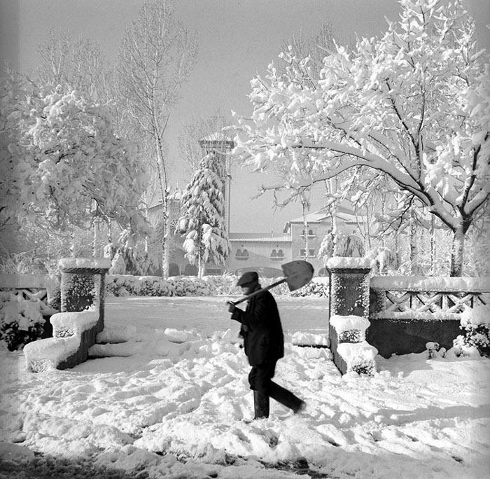 (Ampliar) - Després d'una nevada, un home camina amb una pala a la plaça de l'Assumpció al barri de Sant Narcís. Al fons, l'església. 13 de febrer de 1963. Narcís Sans Prats. CRDI - Ajunament de Girona.
