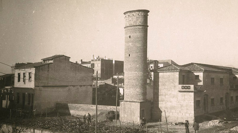 (Ampliar) - Zona d'horts a la carretera de Santa Eugènia on posteriorment es construiria el grup de cases del barri de Sant Narcís. 1945-1949. Salvador Crescenti Miró. CRDI - Ajuntament de Girona. L'església de Sant Narcís.