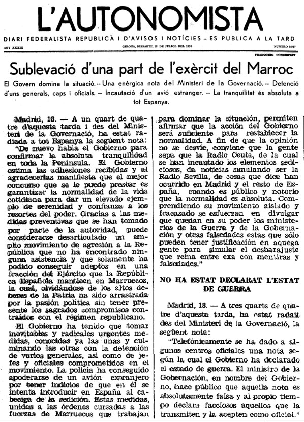 (Ampliar) - Notícia de la sublevació militar al Marroc. Diari "L'Autonomista" del 18 de juliol 1936. SGDAP - Ajuntament de Girona.