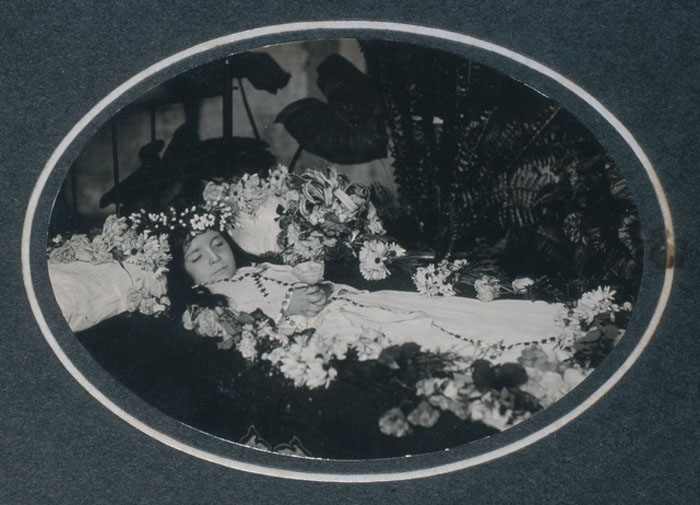(Ampliar) - Retrat post mortem d'una nena envoltada de flors. 1910. Roberto Lomana. Viquipèdia.