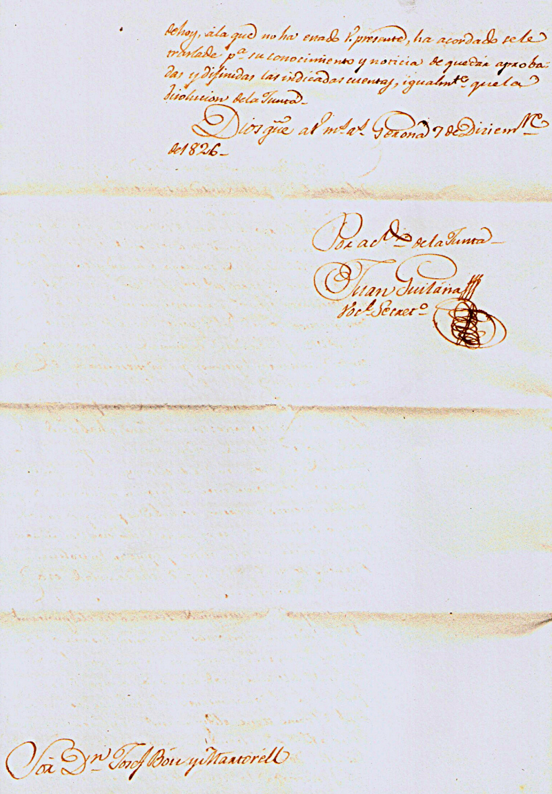 Dios guarde a V. ms as. Gerona 7 de Diciembre de 1826. Por acdo de la Junta. Juan Guilana. Vocl Secreto