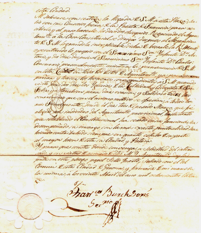 Concurrio personalmente mientras la permanencia de S.M. en esta Ciudad en todos los Actos de Ayuntamto, ya para acompañar y hacer los honores correspondientes á S.M. quando visito por dos dias las Yglesias de la Cathedral y Colegiata de San Felix, ya tambien para dar evasion y Salida a todas las ocurrencias que con el mismo motivo se ofrecian á todas horas. Finalmente, desde el dia tres del pasado Marzo que fué elegido por individuo del Ayuntamto provicional, hasta tanto que establecido el Constitucional ha cesado en sus funciones, ha desempeñado su encargo con la mas exacta puntualidad, habiendo contribuido siempre en quanto estaba de su parte al mayor bien de esta su Ciudad y Patria.