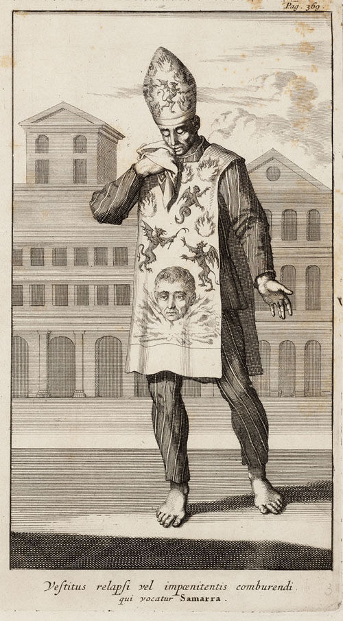 Samarra. La samarra amb dibuixos de flames i rostres diabòlics indica que el condemnat no s'ha penedit i serà cremat viu. Gravat de "Historia Inquisitionis" de Philipp van Limborch, Amsterdam 1692 - (Ampliar) |
