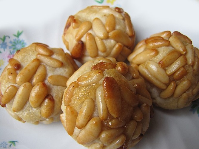 Amb la pasta base preparada fer boles i passar-les per clara d'ou lleugerament batuda, arrebossar-les amb els pinyons sencers. Col·locar-los en una safata per anar al forn, i pintar-los amb clara d'ou. Coure al forn durant uns quinze a vint minuts.