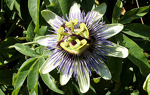 Passionària o Flor de la Passió (Passiflora caerulea)![]() El nom popular que dessigna la planta fa referència a la Passió de Crist: en el dibuix interior de la corol·la s'hi troba una semblança en la corona d'espines; tanmateix la quantitat d'estams, cinc, és el de les ferides que va rebre Jesús i els tres estils, els claus amb què va ser clavat a la creu. També hi ha qui diu que els pètals representen els apòstols, malgrat que n'hi han deu. |