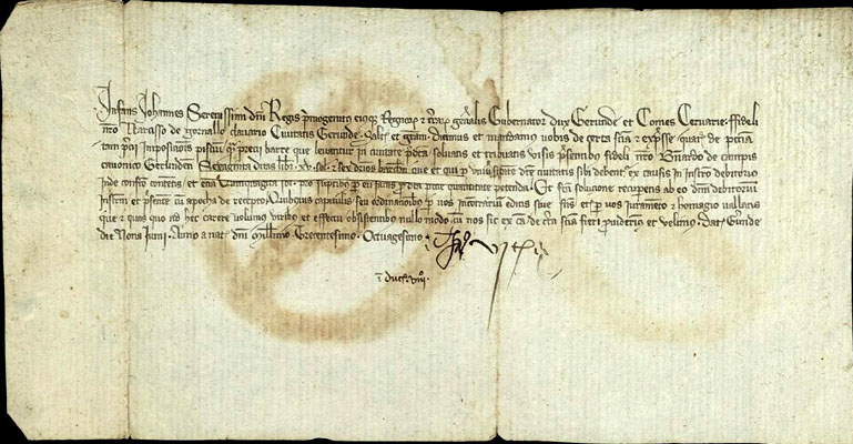 (Ampliar) - 9 de juny de 1380. L’infant Joan, primogènit del rei Pere III i governador general, duc de Girona, a Narcís de Gornal, clavari de la universitat de Girona. Li mana que del preu de la imposició del peix i del dret de barra pagui a Bernat de Camps, canonge de Girona, seixanta-dues lliures, deu sous i sis diners. Fons Ajuntament de Girona. Les Noves Peixateries (Velles).