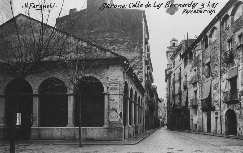(Ampliar) - Les Peixateries Velles. 1920-1926. Valentí Fargnoli i Annetta. CRDI - Ajuntament de Girona. A finals del segle XIII trobem definit el mercat del peix amb més precisió: entre 1291 i 1292 s’esmenten fins a tres vendes de drets de propietaris jueus sobre taules del sector, situades d’est a oest, a la Peixateria de Girona, en l’alou reial; que podrien situar-se en l’actual plaça de les Castanyes, o en un espai, avui edificat, d’amplada semblant. A diferència del que havia passat amb moltes altres activitats comercials, que passaren al mercat de l’Areny al llarg del segle XIII, les taules de les peixateries encara es mantenien en el lloc del mercat vell on havien estat establertes en el segle XII.