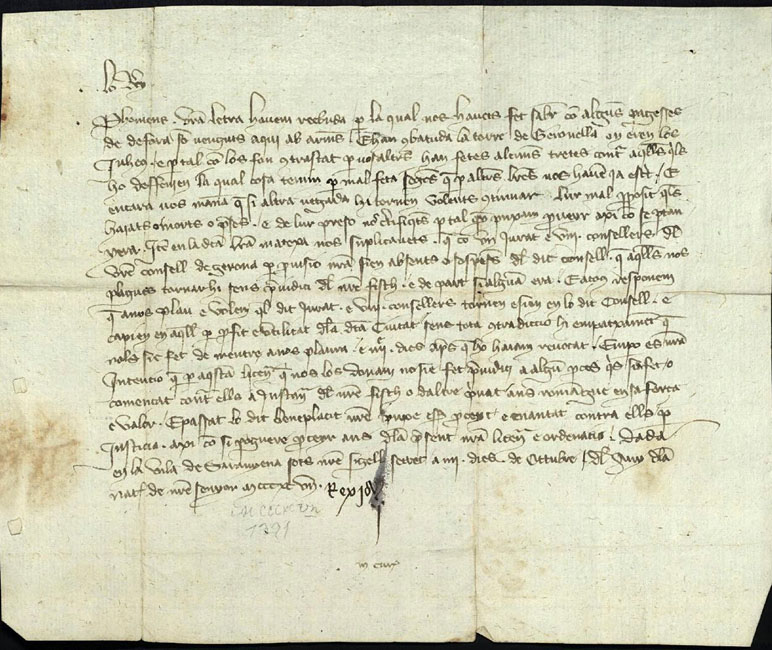 (Ampliar) - 4 d'octubre de 1391. Joan I als jurats i prohoms de la ciutat de Girona. Els respon que condemnin a mort els pagesos forans que ataquin de nou la torre Gironella on es refugiaven els jueus. Lletres reials. Ajuntament de Girona.
