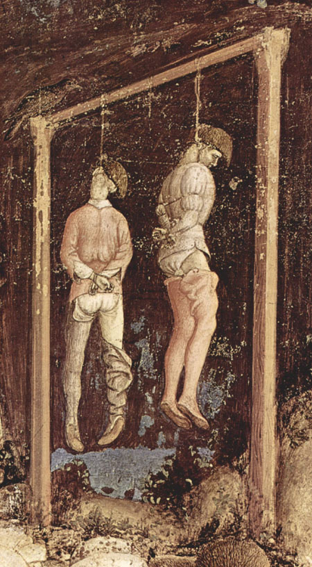 (Veure'l sencer) - Executats a la forca. Detall de San Giorgio e la principessa, de Pisanello. Verona, Chiesa di Sant'Anastasia. Viquipèdia.
